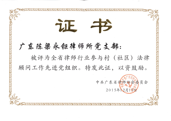 2015年12月评为全省律师行业参与村(社区)法律顾问工作先进党组织