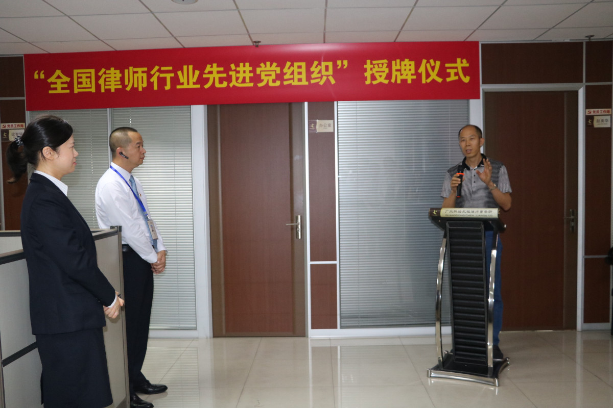 在本次授牌仪式上,中共东莞市律师行业党委专职副书记孙华同志将全国律师行业党委授予的荣誉牌匾,向本所党支部书记赵瑾同志进行了移交。